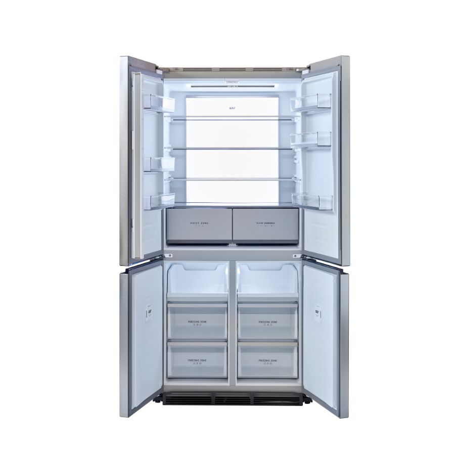 Questo sistema evita qualsiasi interferenza con i mobili laterali, prevenendo urti e danneggiamenti quando il frigorifero è incassato. Consente un’integrazione perfetta anche in nicchie a muro o con il fianco a diretto contatto con la parete poiché la porta può aprirsi comodamente a 90° senza limitazioni. In questo modo è garantita la totale estraibilità dei cassetti interni, unendo funzionalità e massima libertà progettuale.